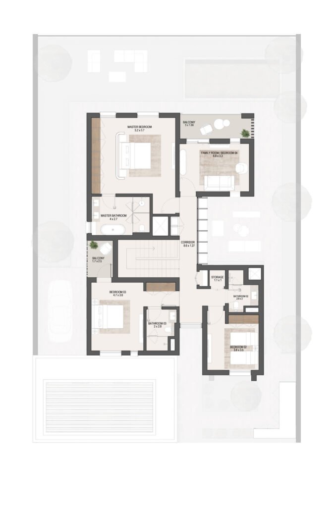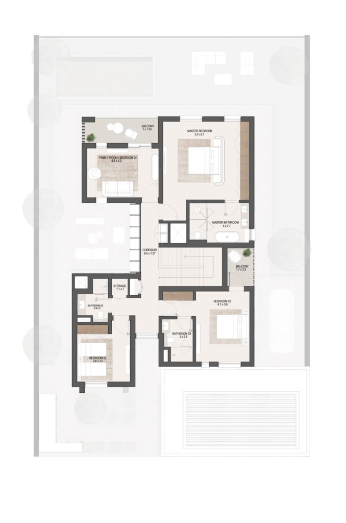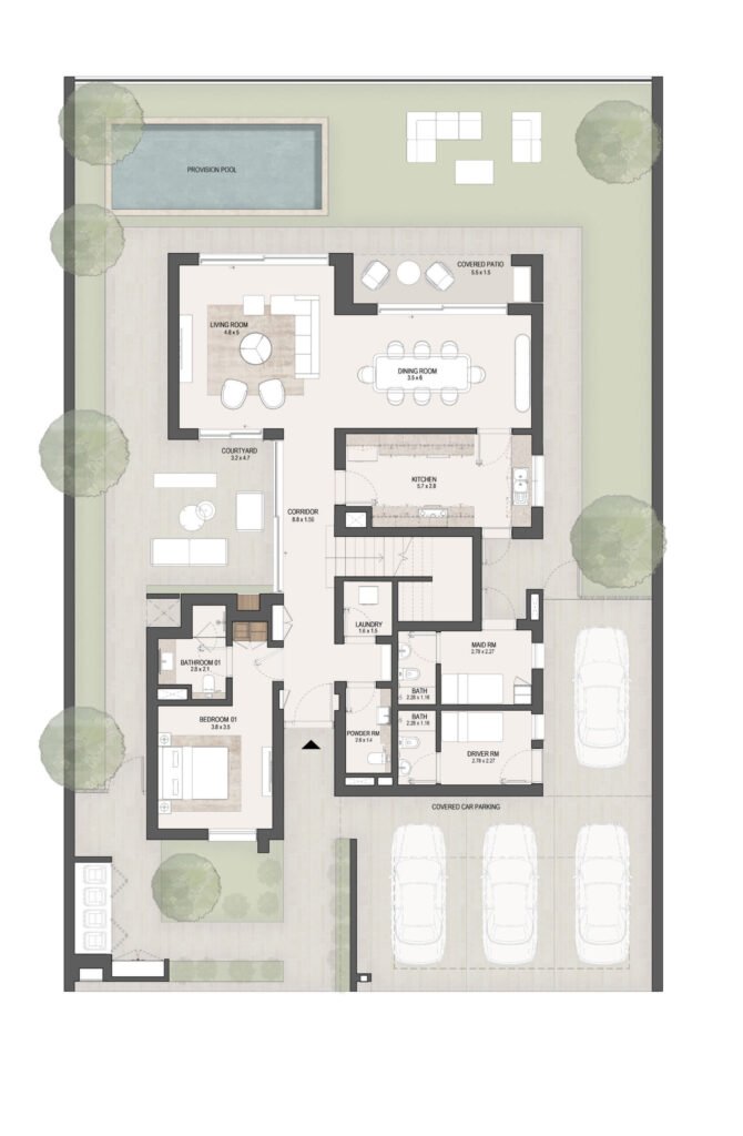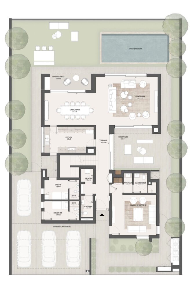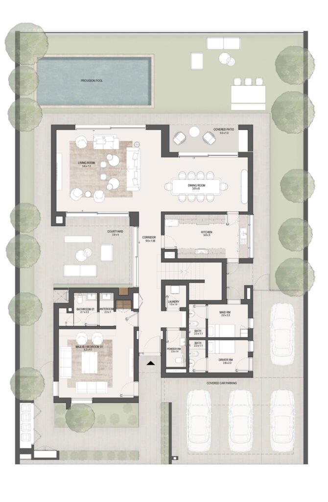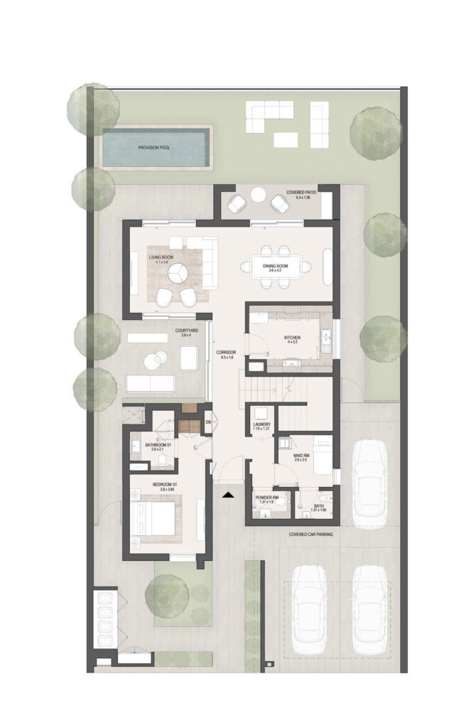The layouts are carefully designed to maximize space efficiency, natural light and ventilation, ensuring comfortable family living in Masdar City, Abu Dhabi.