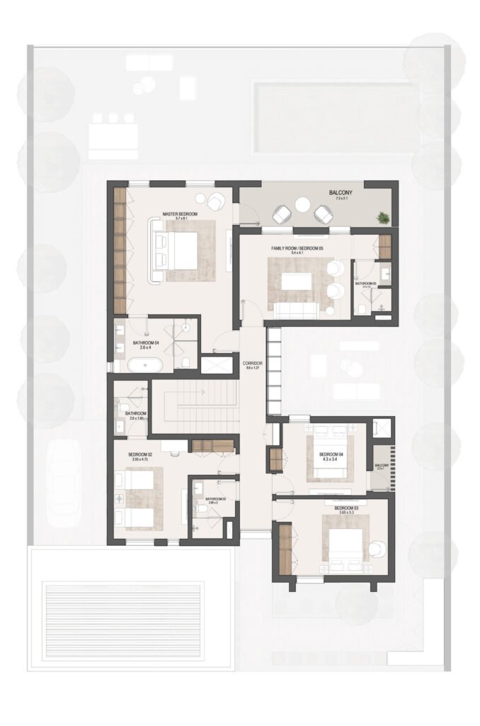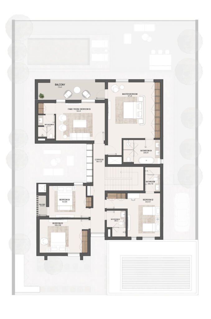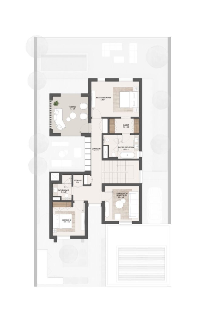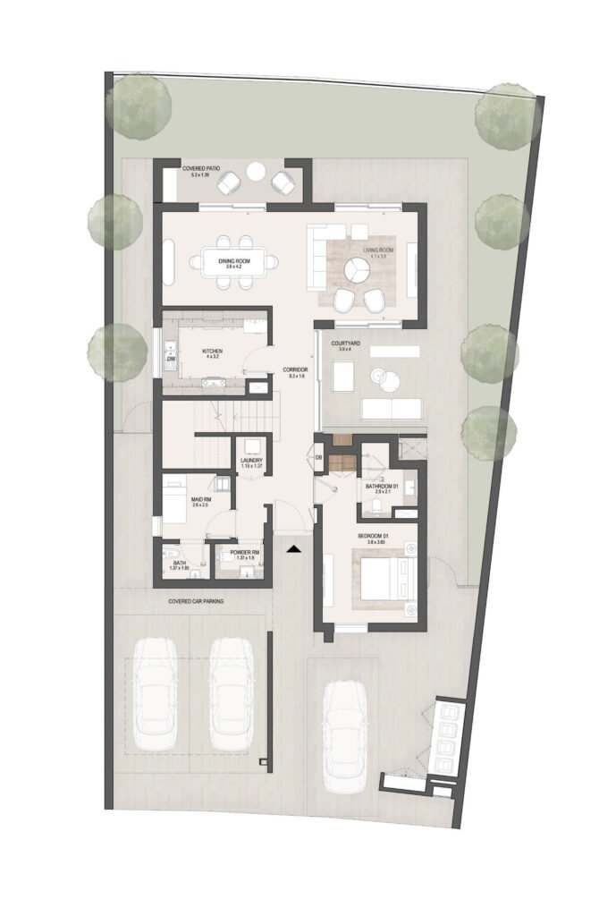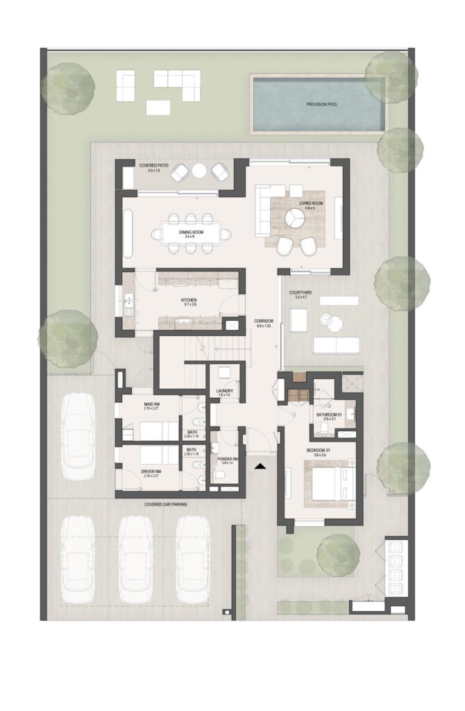 The layouts are carefully designed to maximize space efficiency, natural light and ventilation, ensuring comfortable family living in Masdar City, Abu Dhabi.